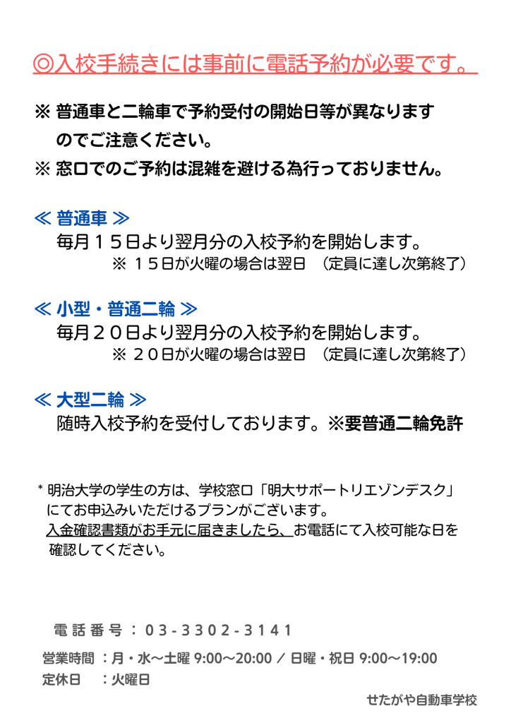 8012025入校予約についてマイナ免許証をお持ちの方は、ご予約時にその旨お知らせください。※お手続き時に4桁の暗証番号が必要です。(暗証番号を忘れた、分からない場合はお手続きができません。) Tweet Share Hatena Pocket RSS feedly Pin it MT免許取得をご希望の皆様へ前の記事 営業時間変更に伴う重要なお知らせ次の記事