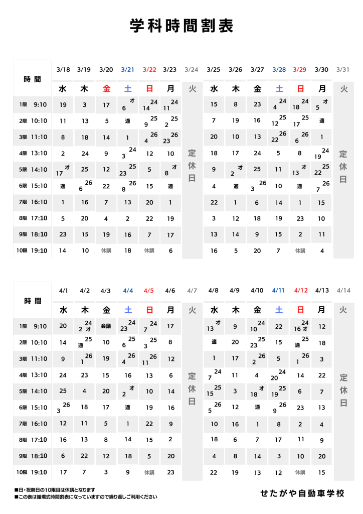 ※ 自動二輪の技能教習は、平日の14:10~15:00(5時限目)の教習はありません。