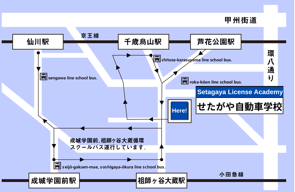 京王線(千歳烏山駅、仙川駅、芦花公園駅)と小田急線(成城学園前駅、祖師ヶ谷大蔵駅)から教習所まで無料の送迎バスを運行しています。路線内ではどこからでもご乗車できます。手をあげてお知らせ下さい。