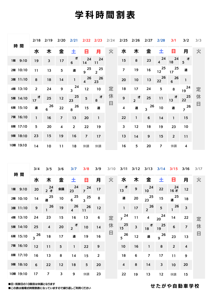 ※ 自動二輪の技能教習は、平日の14:10~15:00(5時限目)の教習はありません。