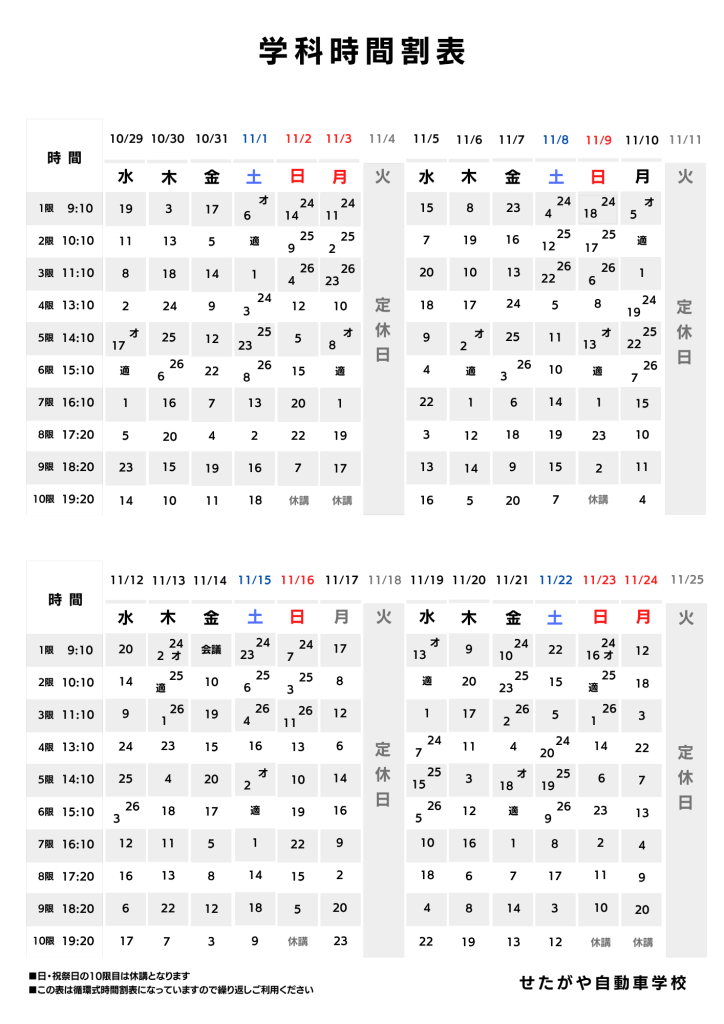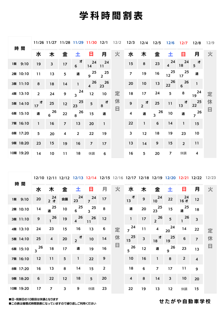 ※ 自動二輪の技能教習は、平日の14:10~15:00(5時限目)の教習はありません。